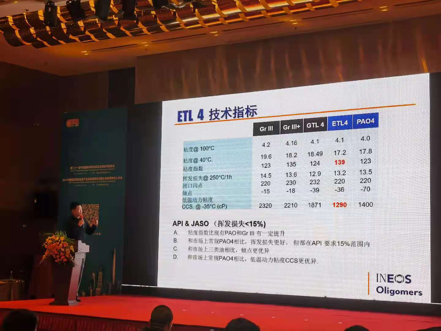 銷售總監(jiān)丁舸(下圖)在產(chǎn)業(yè)發(fā)展高峰論壇上給賓客展示INEOS的新一代PAO(ETL4)。