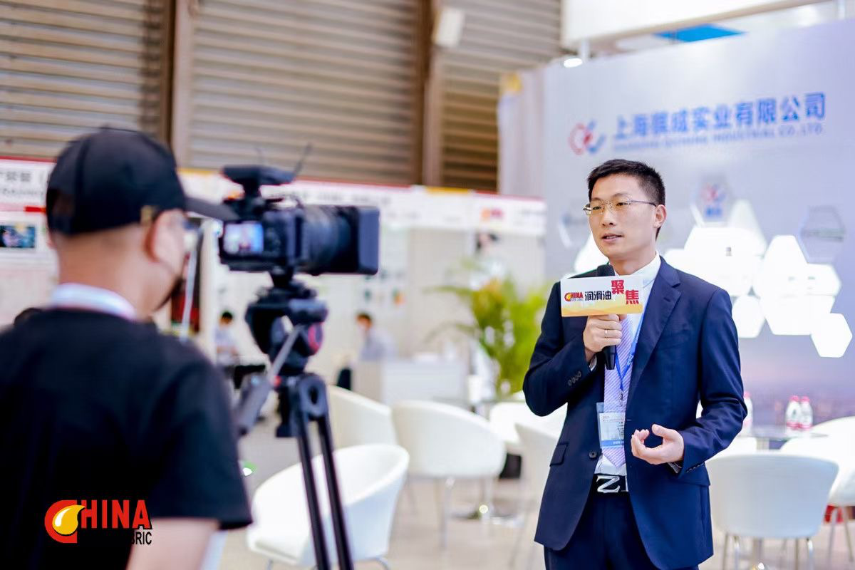 上海棋成潤(rùn)滑材料有限公司副總經(jīng)理劉鋒接受媒體采訪(下圖)。