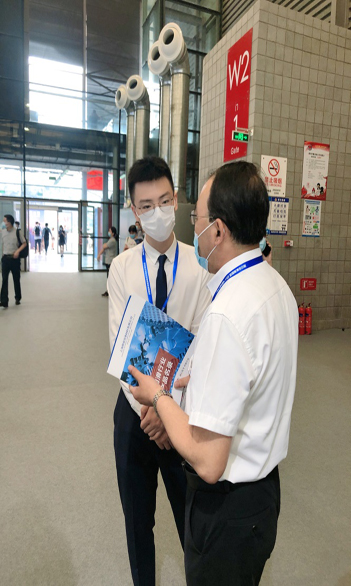 供應(yīng)商盟慶信邀請(qǐng)業(yè)務(wù)主管沈永彪一起在展臺(tái)給賓客介紹(下圖)。