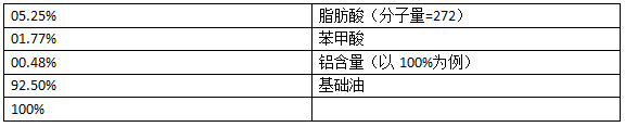 基礎(chǔ)油為650SUS,其苯胺點(diǎn)為99℃,皂含量為7.5%,苯甲酸和脂肪酸的摩爾比為0.75,總酸與總鋁的摩爾比為1.9,該配方可描述如下: