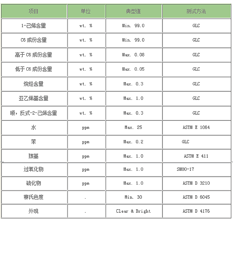 本產(chǎn)品作為LLDPE,HDPE,PP等塑料的共聚單體,可以獲得比用1-丁烯做共聚單體性能更好的塑料產(chǎn)品。