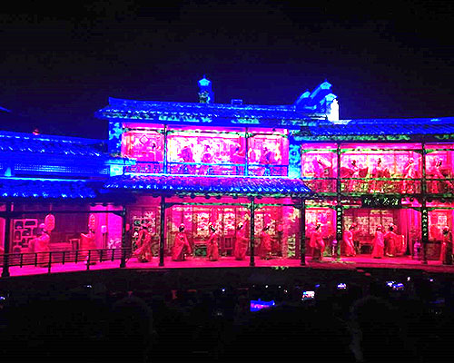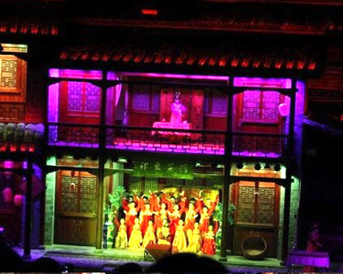 由張藝謀策劃的《印象大紅袍》以武夷山茶文化為表現(xiàn)主題的大型實景演出,演出地點就在著名的大王峰山腳下。三百六十度旋轉的觀眾席,五分鐘內即可完成一周旋轉,舞臺視覺總長度達一萬兩千米。長達七十分鐘的演出,在完全開放的“山水”間進行,堪稱世界上第一座“山水環(huán)景劇場”。
