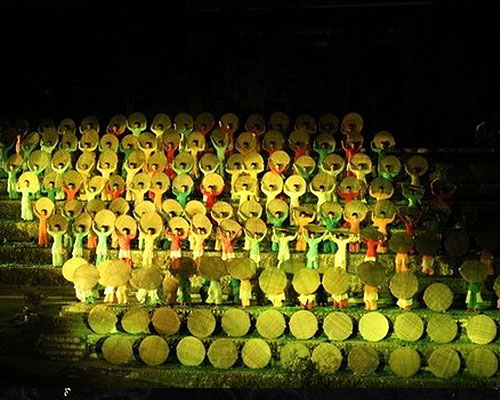 《印象大紅袍》是借茶說山、說文化、說生活,突出一個和諧生活的理念,希望大家把煩惱、抱怨、痛苦和郁悶都放下,喝杯茶,享受茶的寧靜和諧,享受美好的生活。演出中有一個最大亮點:演員們一聲吶喊,大王峰和玉女峰被瞬間照亮,演員們再一聲吶喊,水也被燈光瞬間照亮,演員們開始講述大王和玉女的愛情故事,歷史如水潺潺蕩漾出優(yōu)雅的線條,流連在古代才子的對月獨酌,月下佳人的顰笑扶搖、環(huán)佩叮當間。這就是史無前例的“矩陣式”實景電影,將15塊電影銀幕融入自然山水之中,組成“矩陣式”超寬實景電影場面,現(xiàn)場效果如夢似幻。