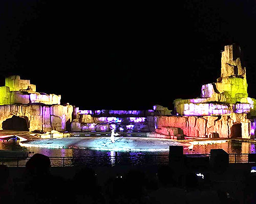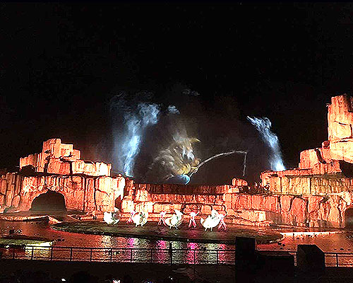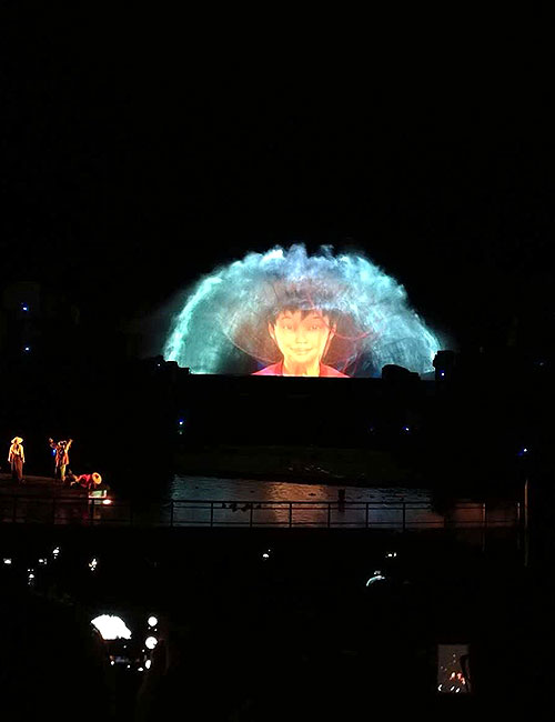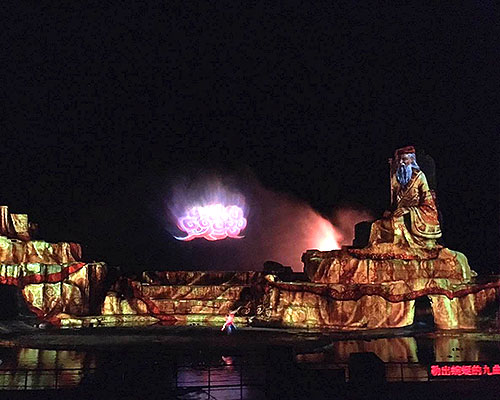 武夷水秀劇場表演的“夢之泉”演出運用激光、音頻、影像、4D動畫、自動噴泉、水霧、煙火等多媒體表現(xiàn)形式,結合武夷本土文化,歌頌了九曲溪水的九個美德(純潔、美麗、智慧、力量、生命、財富、永恒、和諧、想象力)。