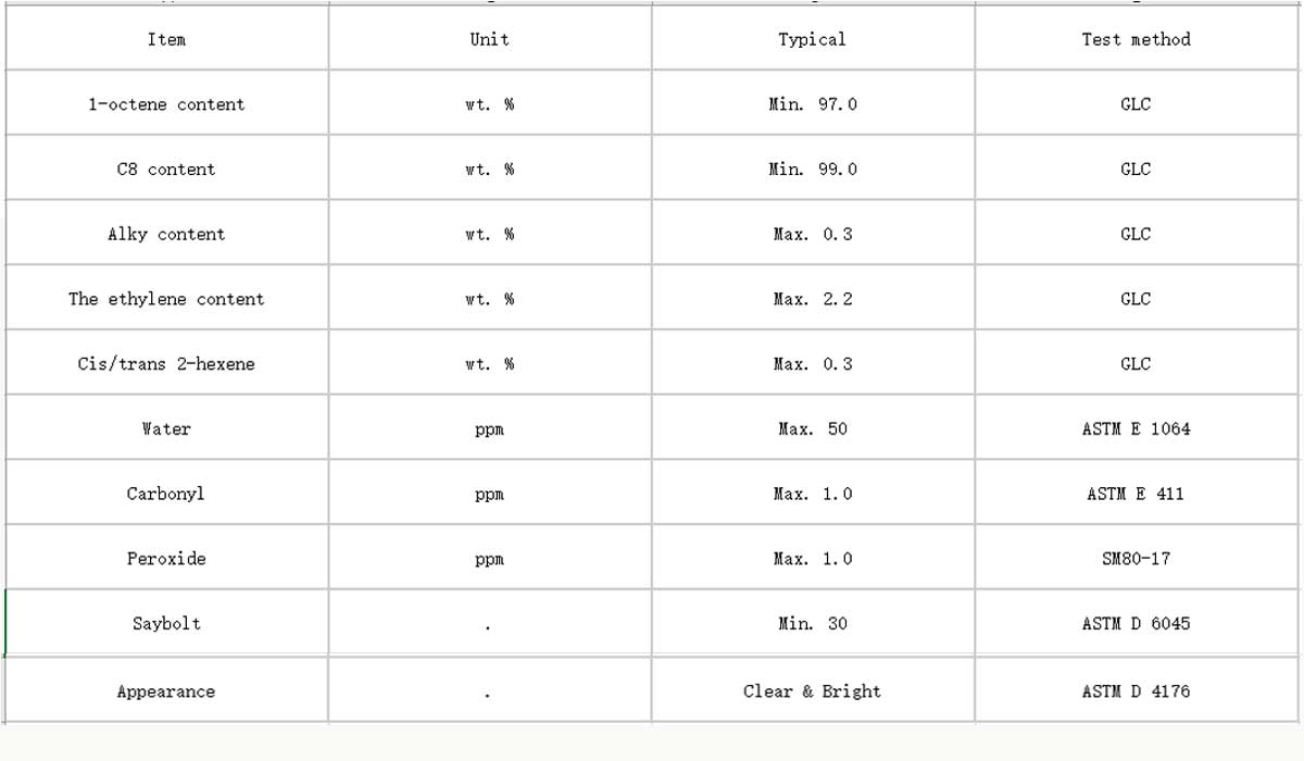 1,PE,PP: As the copolymerized monomer of LLDPE, HDPE, PP and other plastics, this product can obtain a better performance than using 1-butene as the copolymerized monomer.