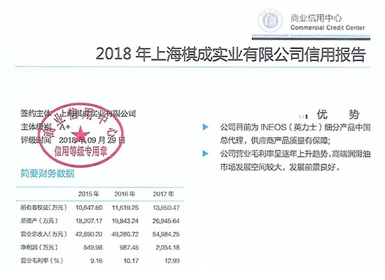 作為一家民營企業(yè),上海棋成實(shí)業(yè)有限公司能夠獲得商業(yè)信用中心評定的A+信用等級,是全體上海棋成人的驕傲,我們將繼續(xù)秉持“誠信自律 合作共贏”的行業(yè)誠信理念,致力于把最好的化工原料推薦給客戶,與客戶共成長,與行業(yè)共發(fā)展。